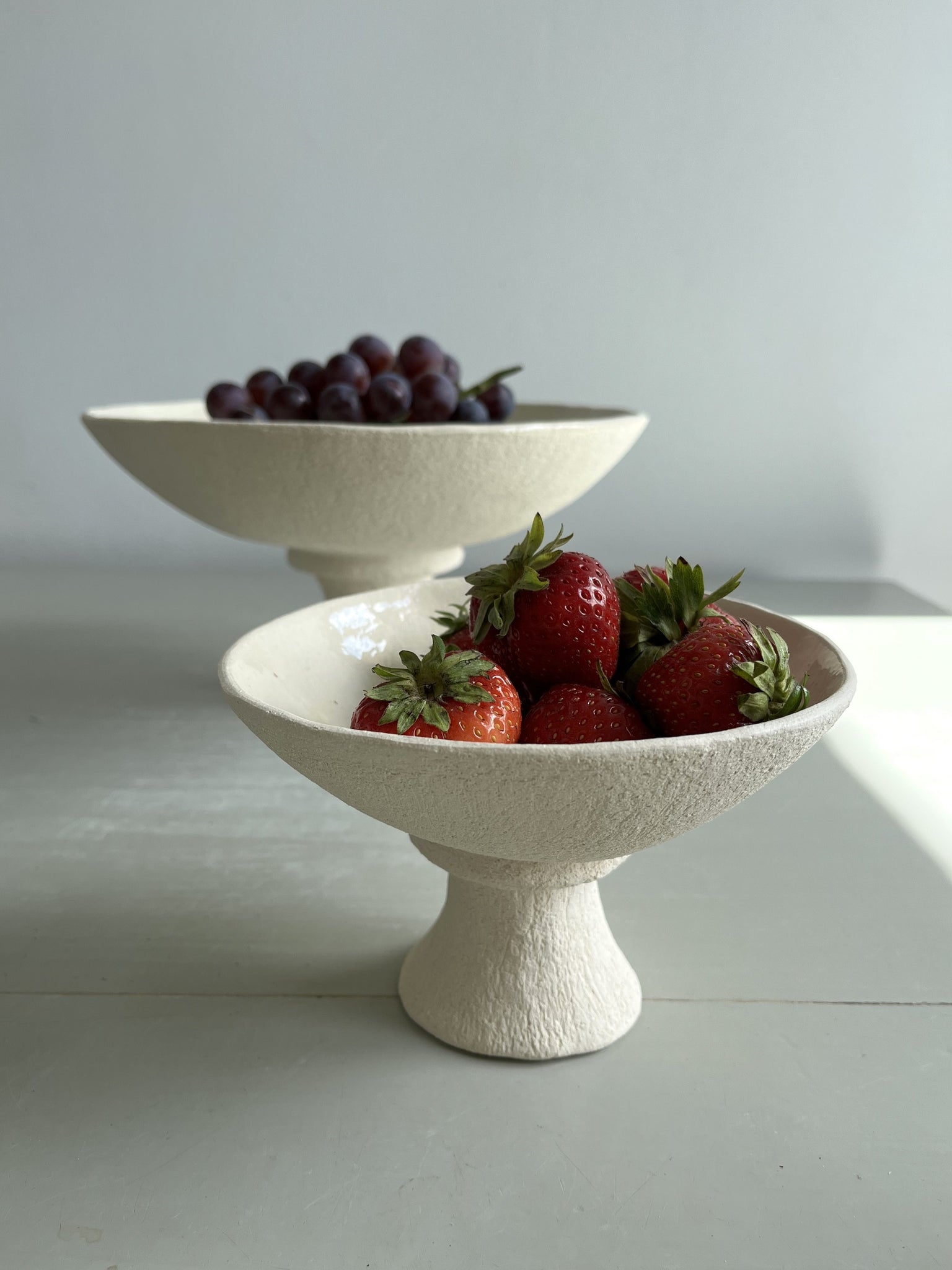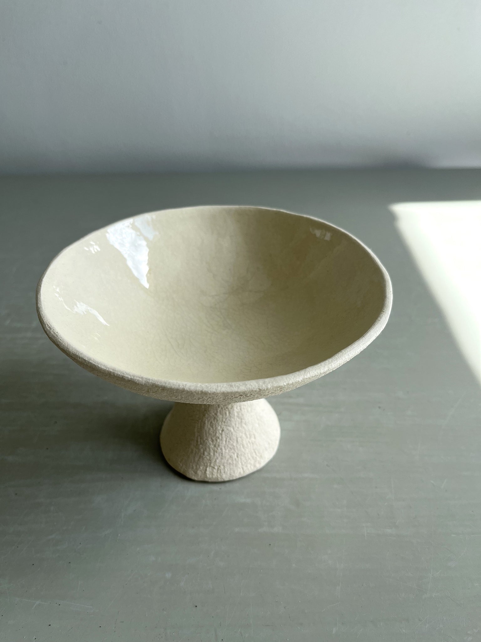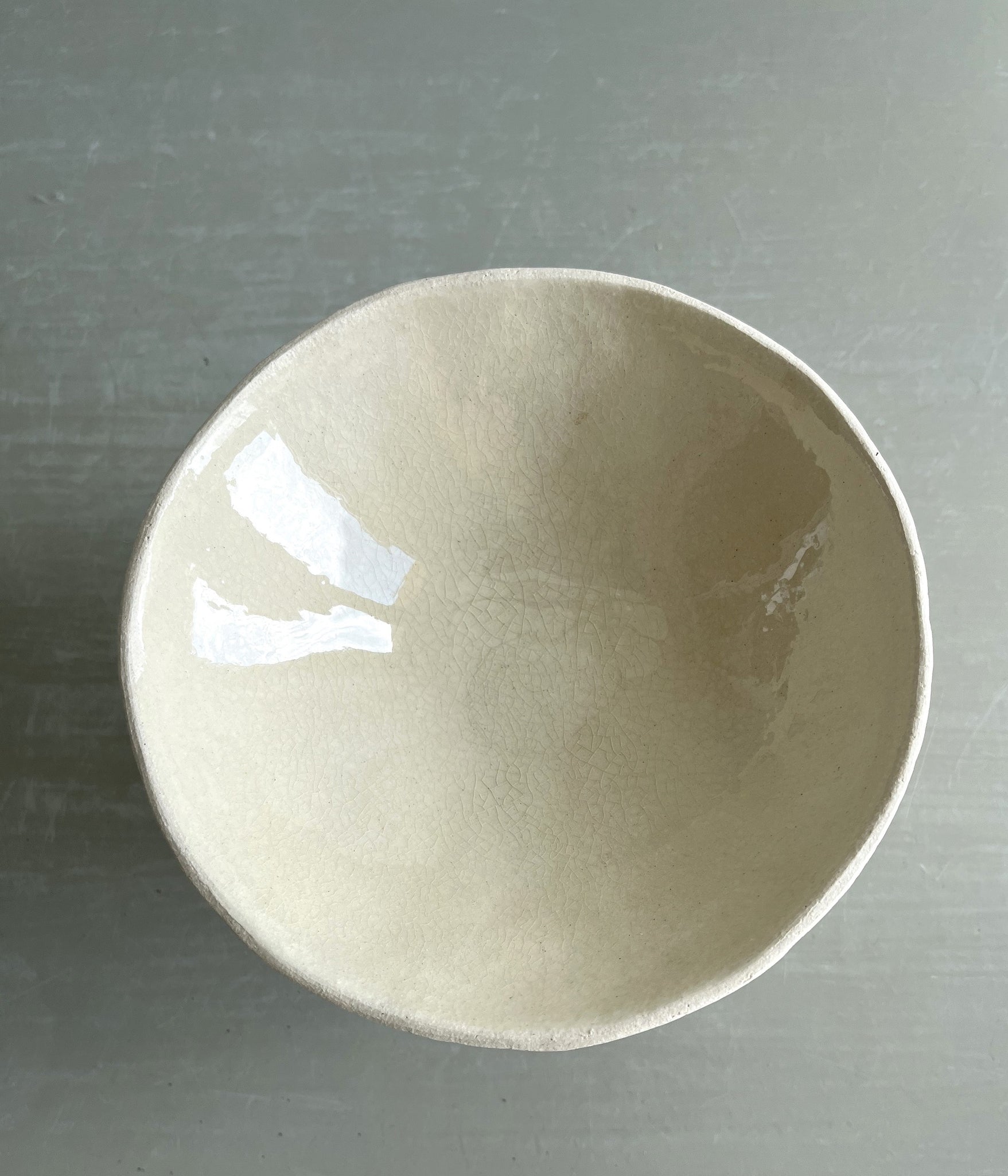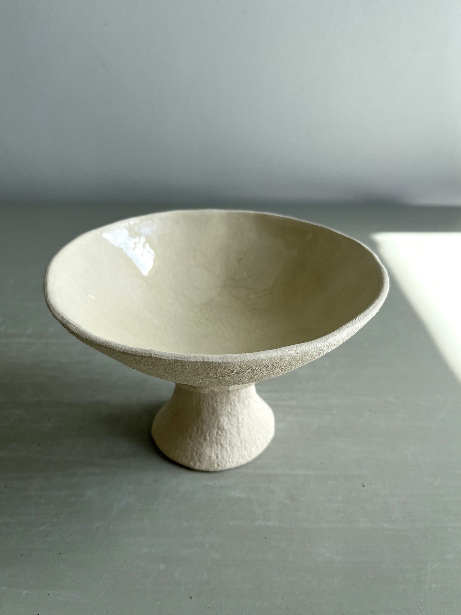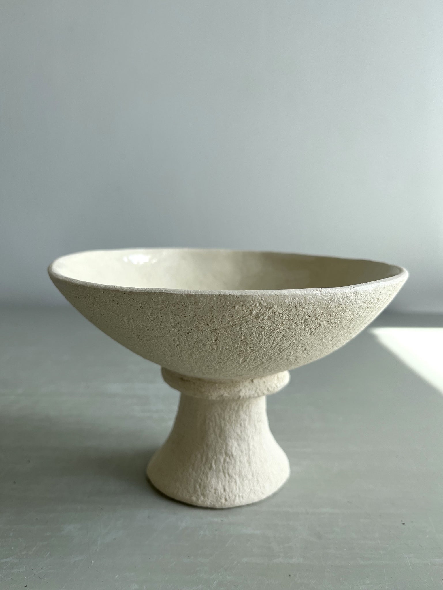 Handmade, coiled and pinched in white stoneware clay with transparent glaze on the inside of the bowl.