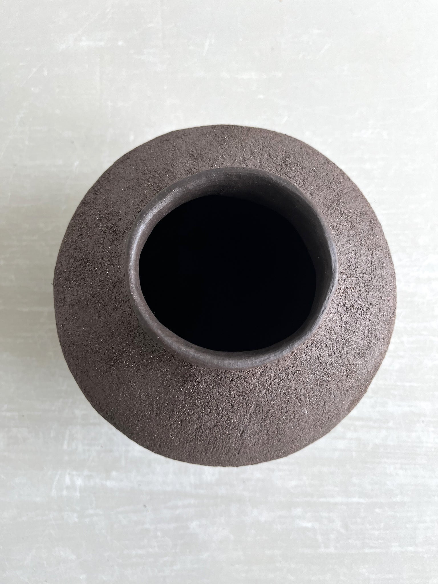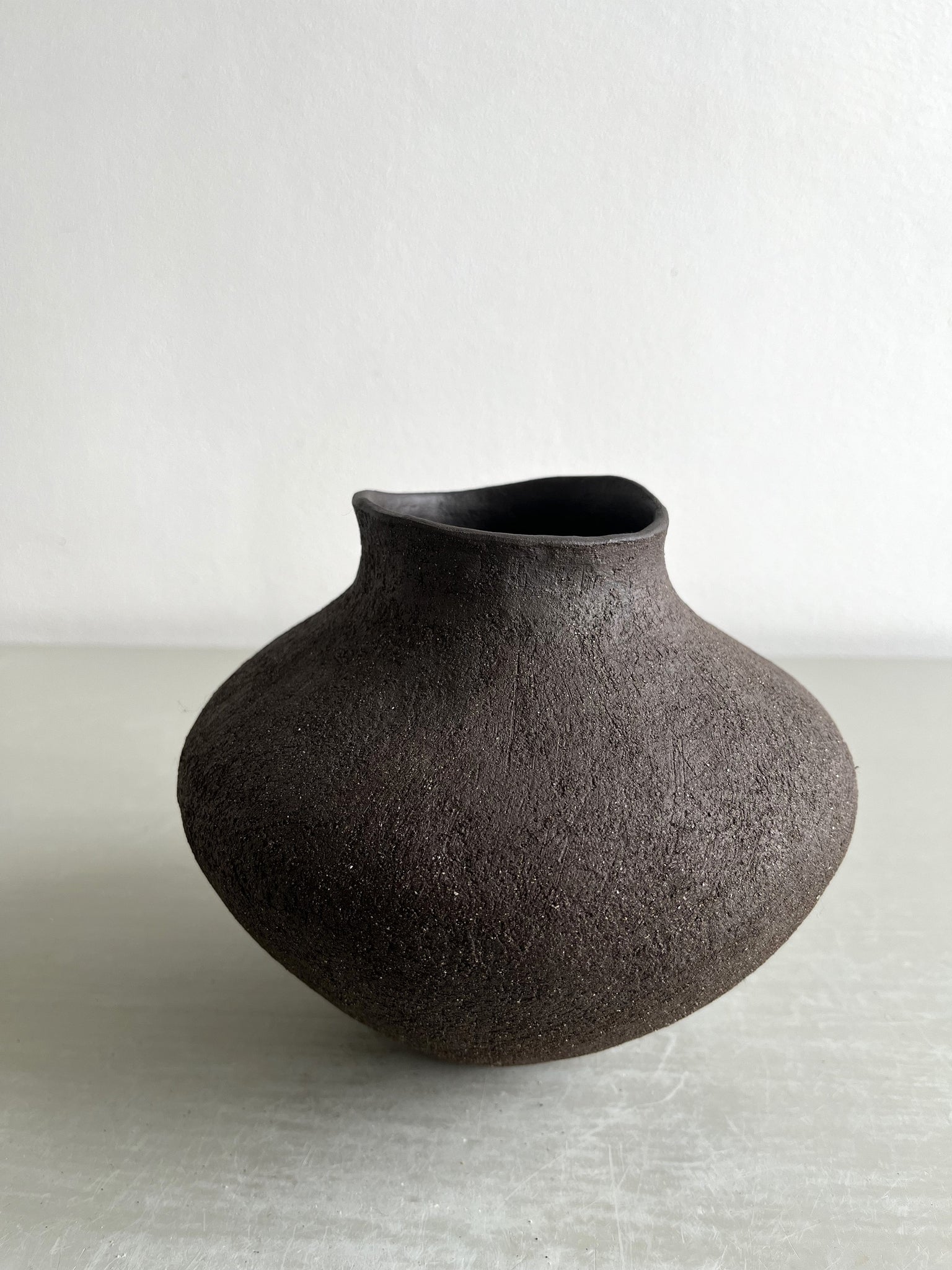 Handmade, coiled low-wide vessel in black clay. No glaze.