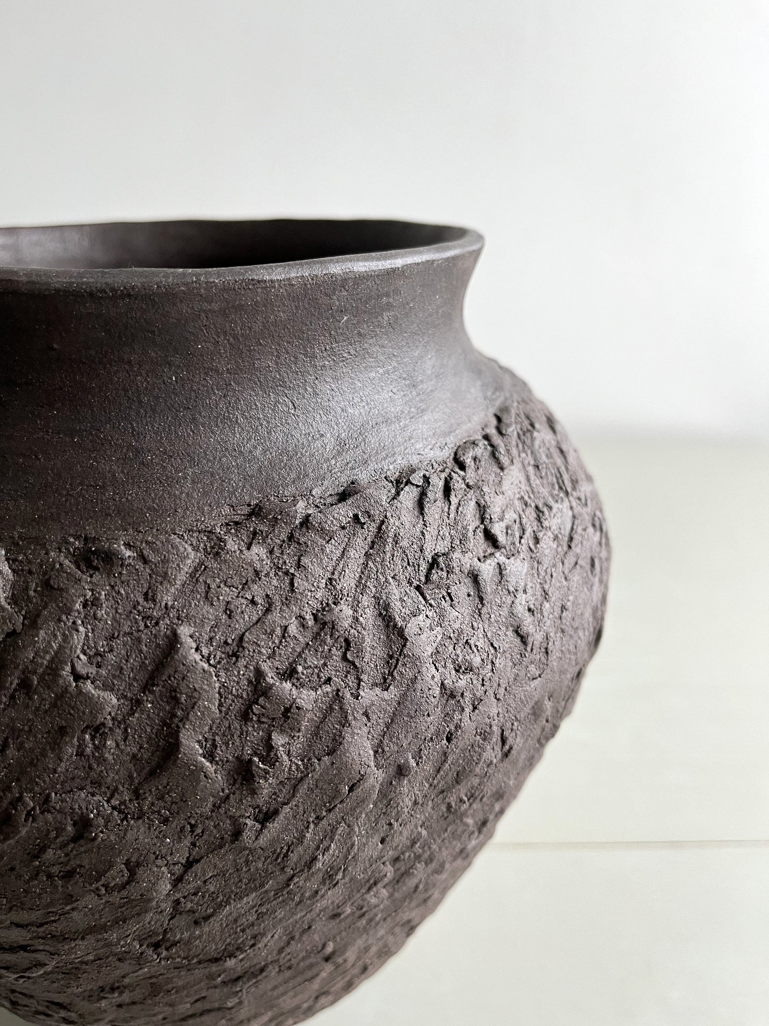 Handmade, coiled vessel in black clay with texture on the surface. No glaze.